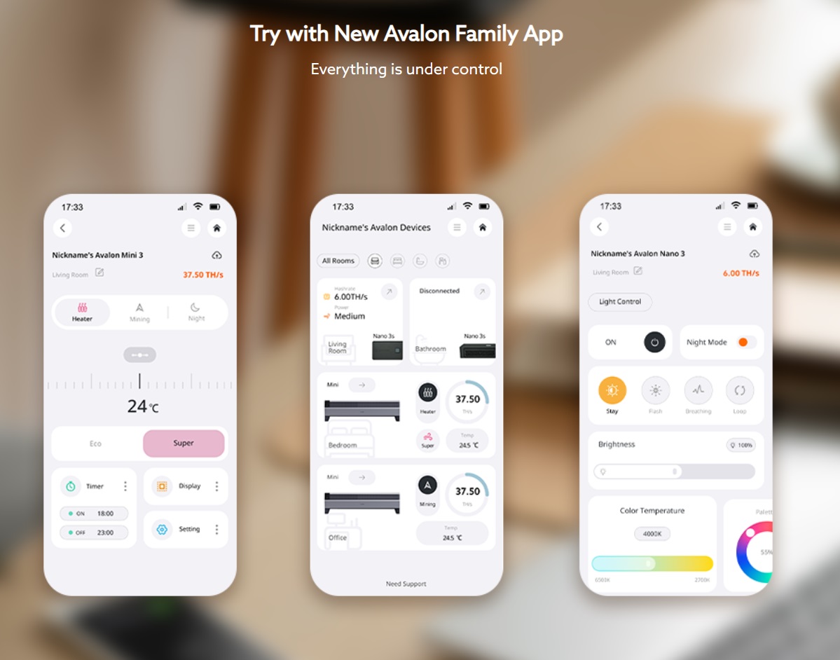 Unlike repurposed datacenter ASICs, the Avalon Nano 3s was built from the ground up for normal living spaces. Compact footprint, quieter operating modes, soft lighting and a simple web UI make it a genuinely livable miner – something you can keep in the same room as you without going mad.