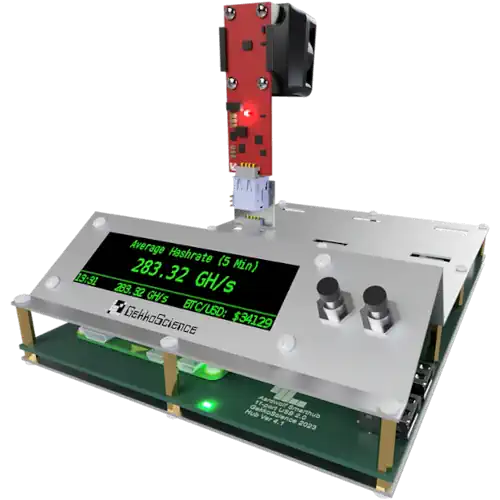 The all-new GekkoScience SmartHub! Featuring an integrated Raspberry Pi 2 Zero, this hub allows any GekkoScience mining gear to be pretty much plug and play. The integrated Raspberry Pi 2 Zero computer means no external computer is necessary. A CompacF Stick is included. 250 – 300 GH/s of mining out of the box!