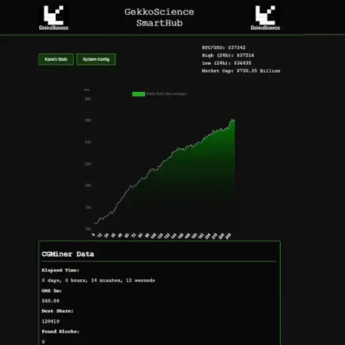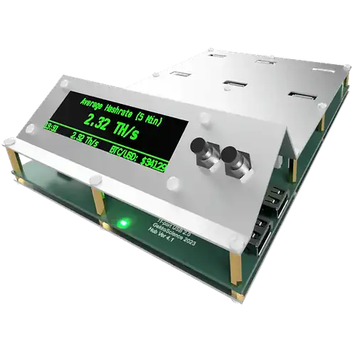 Features and OLED screen with real-time hash rate, BTC value, device stats and more. Also features a web page front end for stats and configuration.
