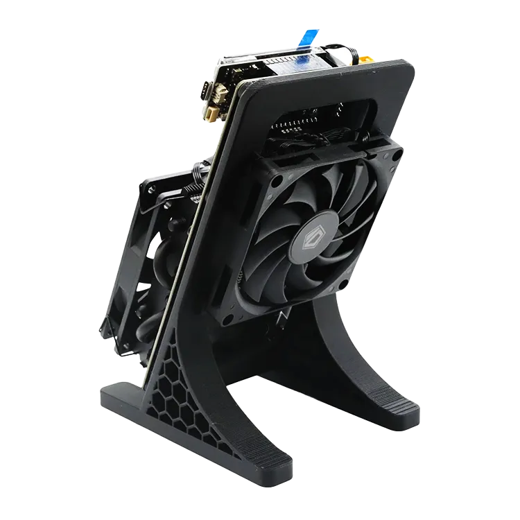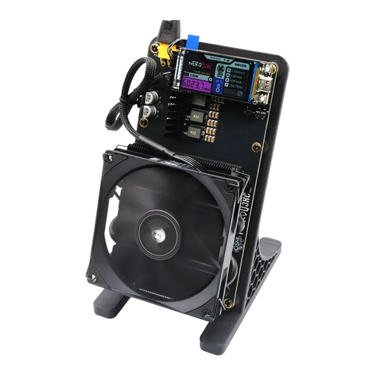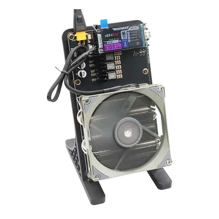Cooling is handled by a Thermalright AXP90 X36 low-profile CPU cooler, mounted using standard desktop patterns. It’s quiet, compact, and extremely effective – ideal for running the NerdQAxe++ on a desk, shelf, or test bench without turning the room into a server hall.